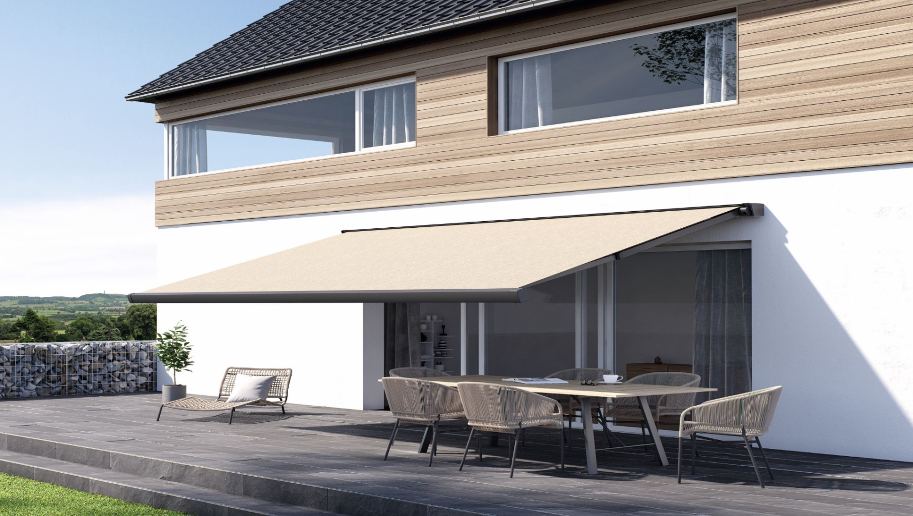 Die MHZ art_01 vereint Design und Technik in einem. Puristisch, modern, zeitlos – so wirkt diese Kassetten-Markise an Wand, Dach und Sparren.